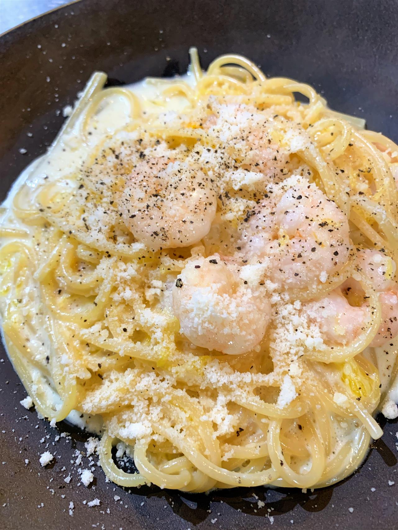 『ネーブルオレンジと小海老のクリームソーススパゲティ』オレンジは皮と果肉を入れて爽やかに🦐