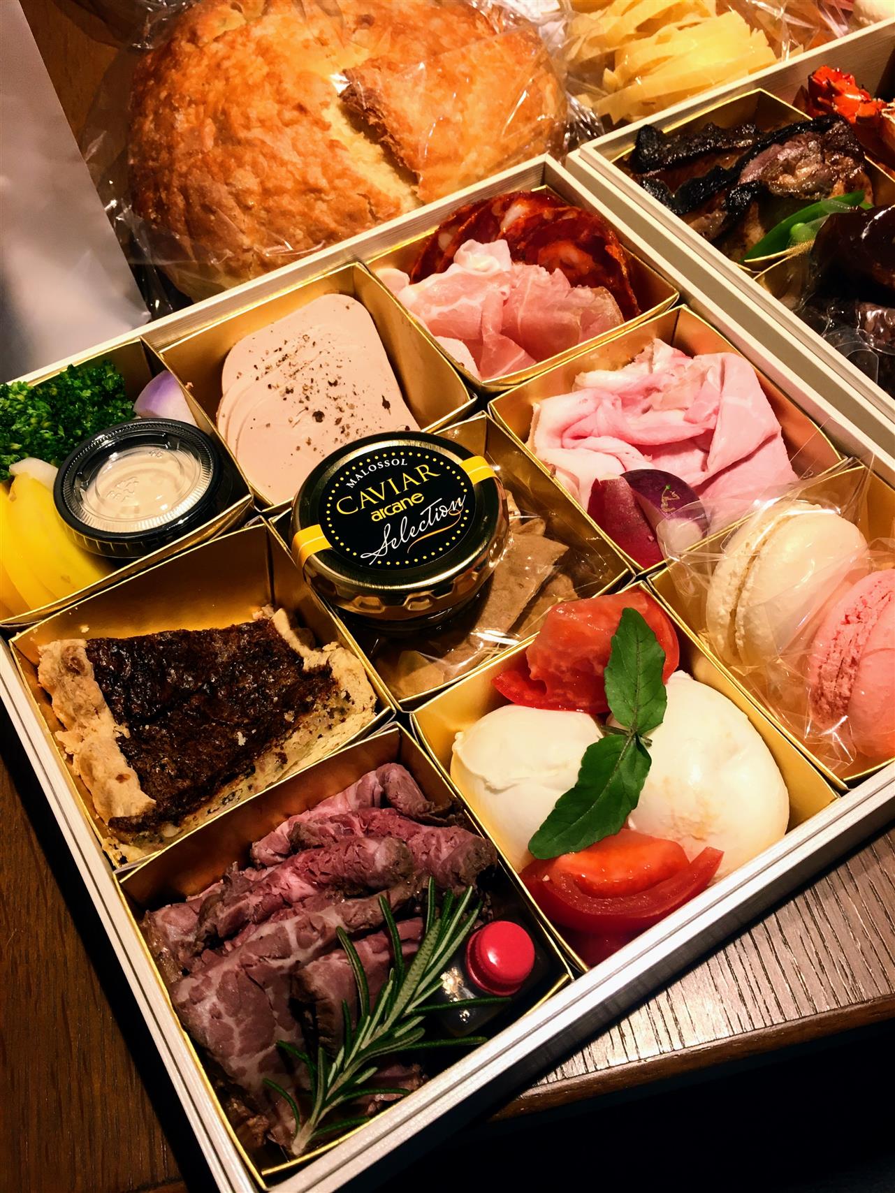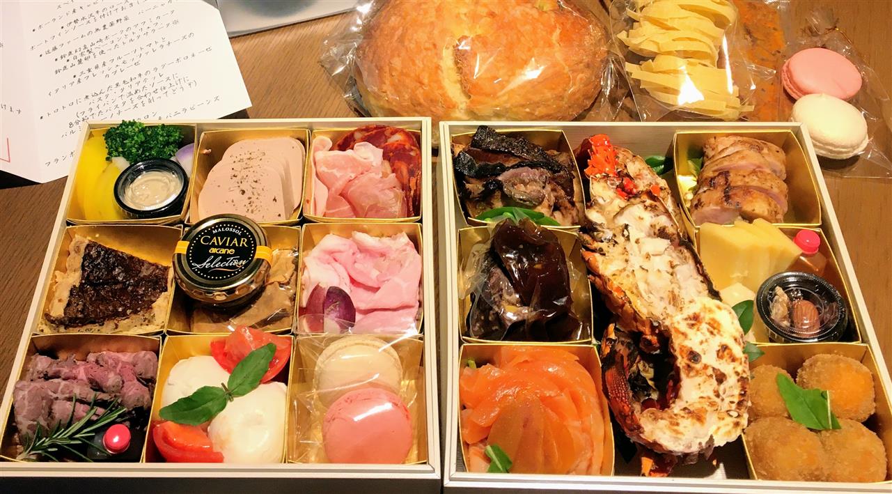近藤ファームの無農薬野菜、黒毛和牛、鮑、生ハム、チーズ、自家製フォカッチャ、マカロンなどをお重に詰めてご用意いたします