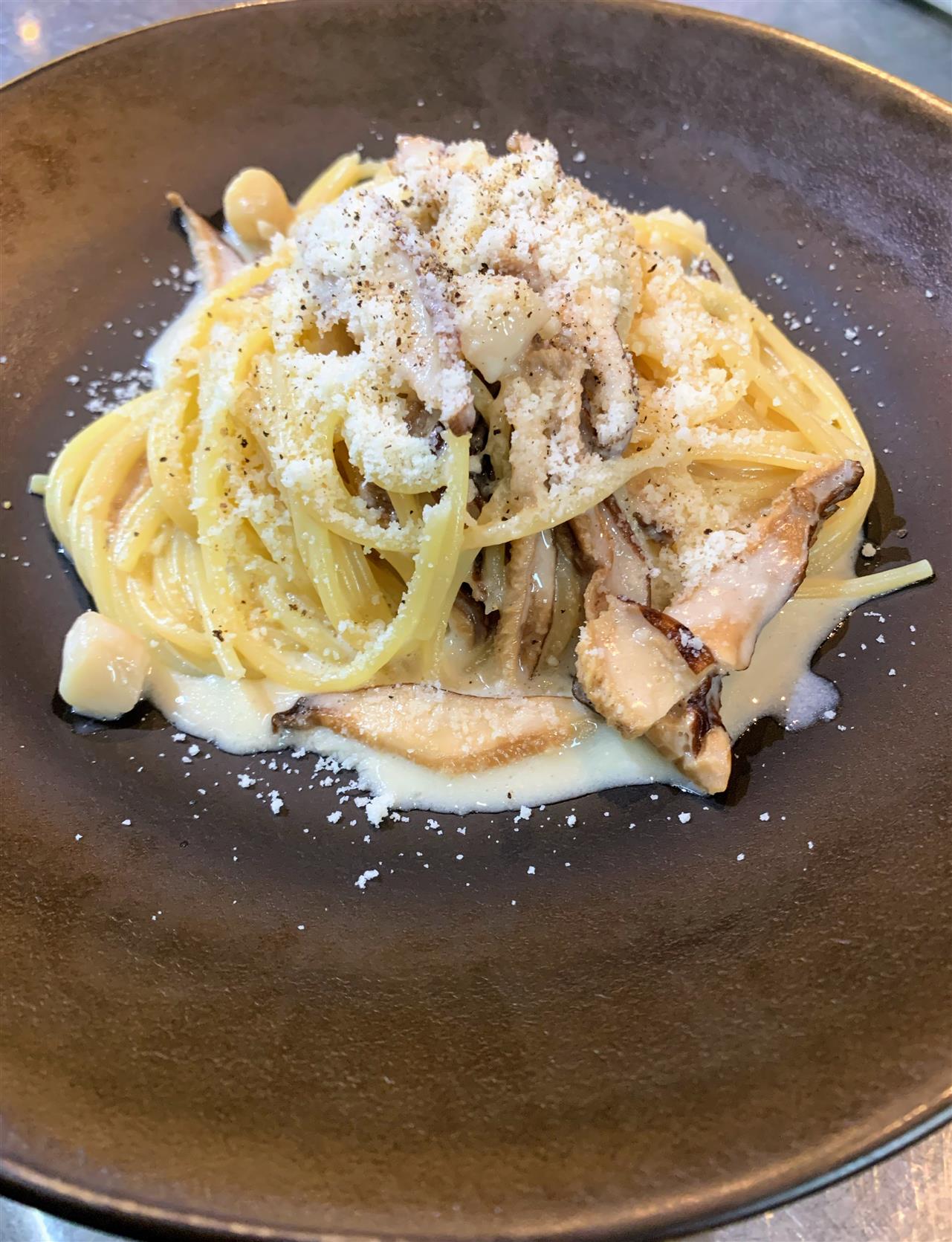 『鈴鹿産椎茸と小柱のクリームソーススパゲティ』鈴鹿山麓の干し椎茸を使用。香りと旨みが美味しい😋