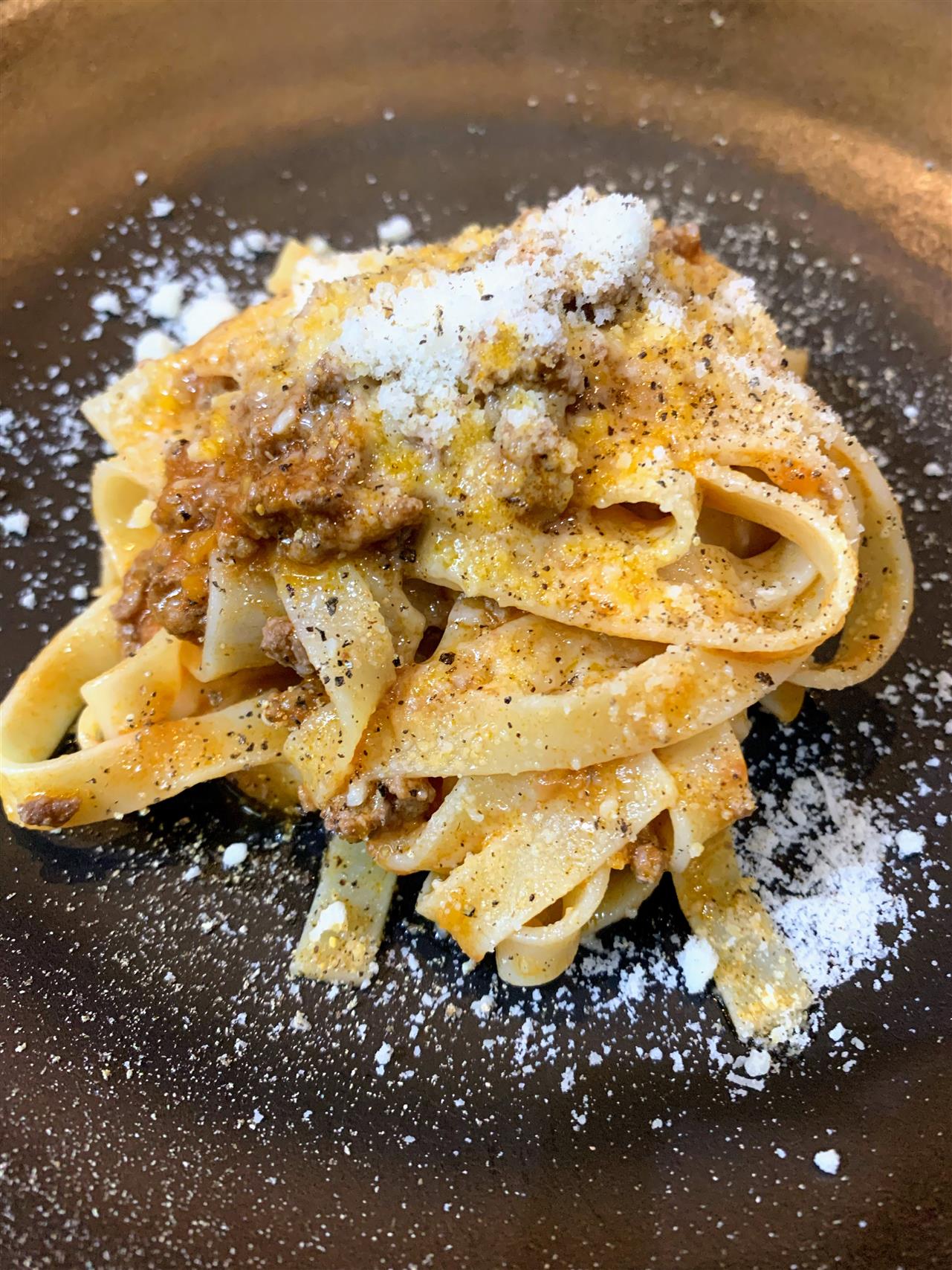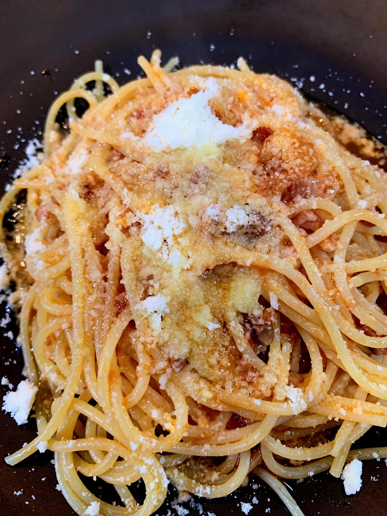 『“アマトリチャーナ“新玉葱と生ハムのピリ辛トマトソーススパゲティ』