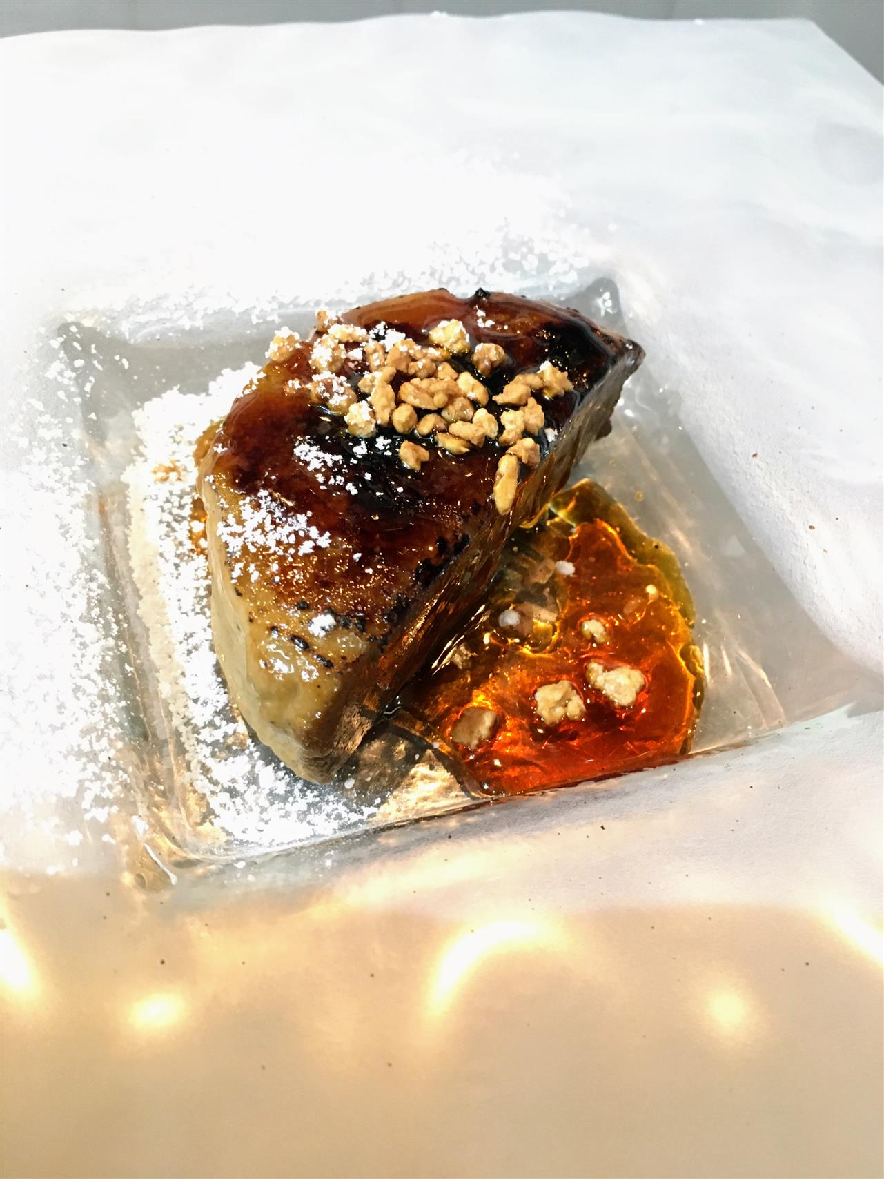キャラメル風味の洋梨プリンを凍らせ、表面はブラウンシュガーを炙って飴状にしてあります✨