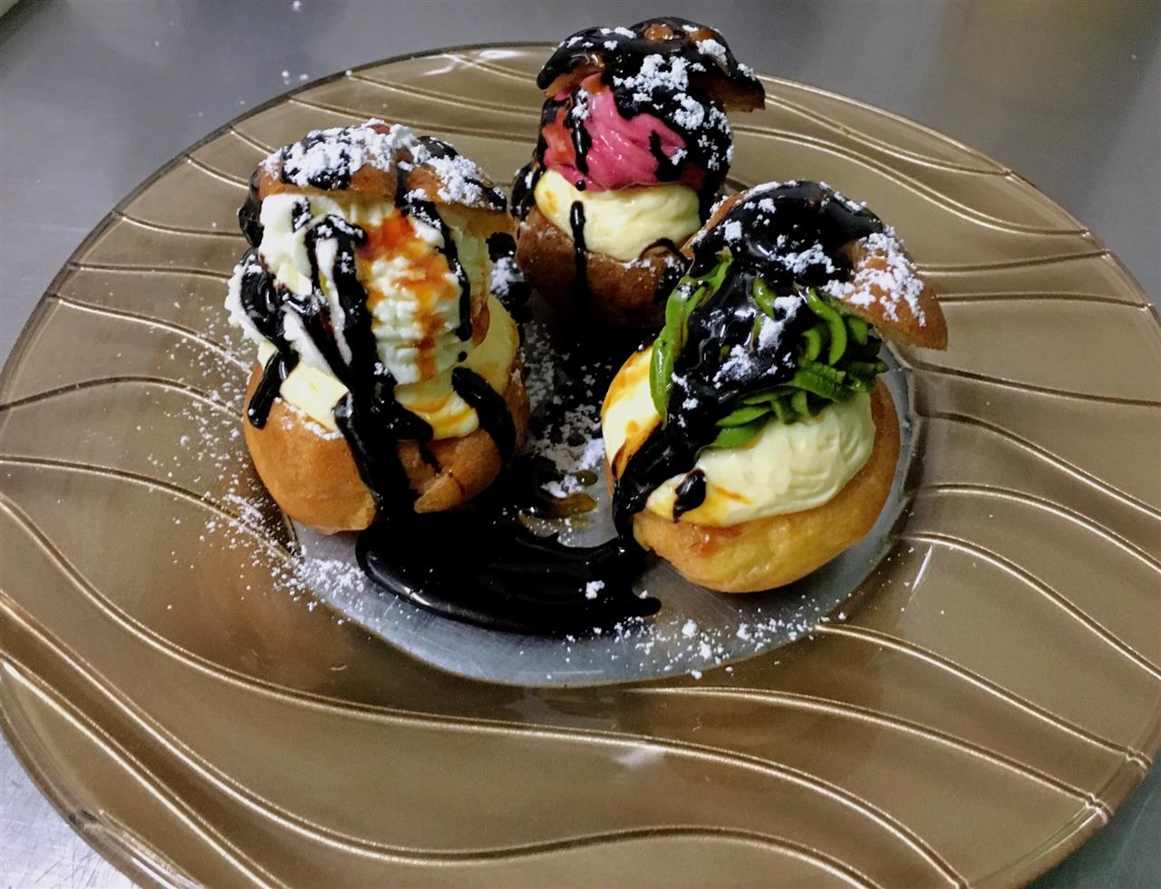 ミニシューにダークチョコソース。緑・白・赤トリコローレカラーのクリームは「鈴鹿産緑茶・ホワイトチョコ・フランボワーズ」です✨