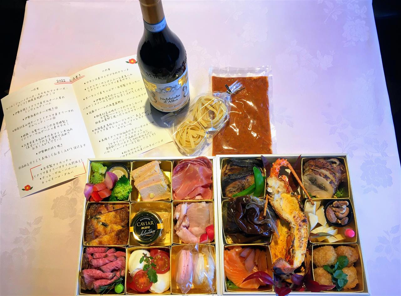 *2段重 自家製フォカッチャ・マカロン・ワイン付き(※写真は2022年お重。内容は異なる場合がございます)