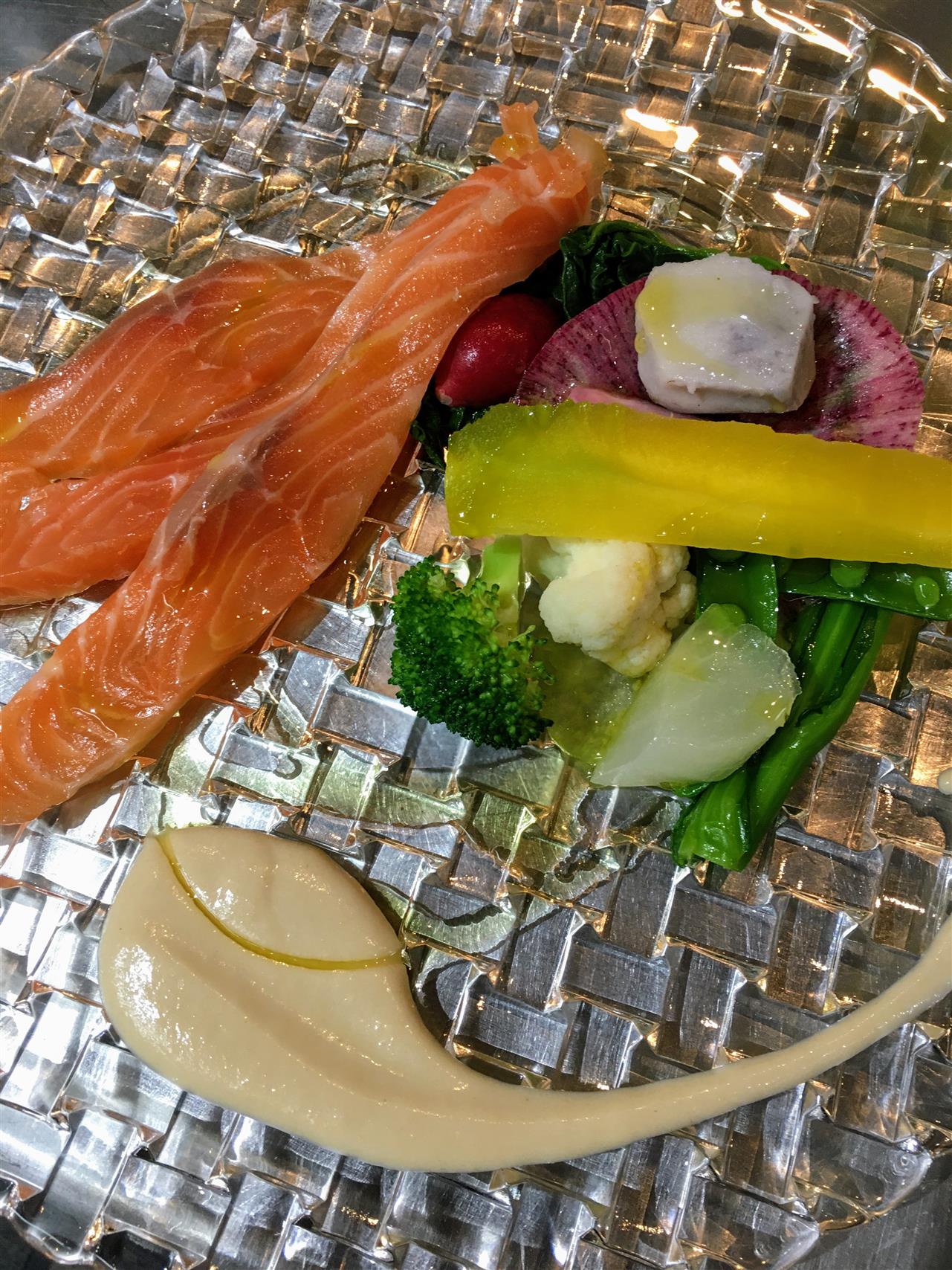 『近藤ファームの旬野菜と自家燻製した白鷺サーモンのカルパッチョ』